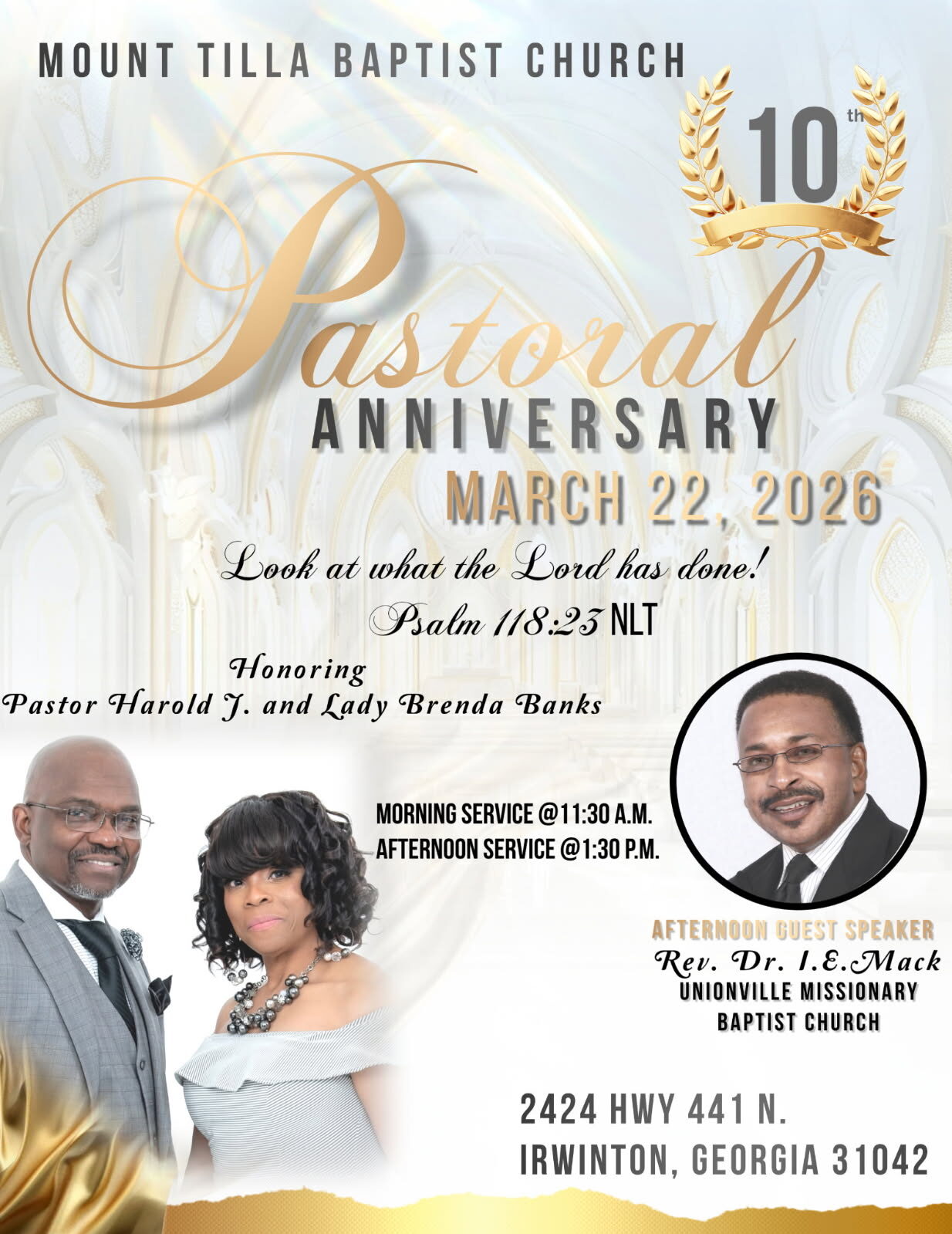 A son of the church, Pastor Harold Banks has invited the congregation and community to his 10th Pastoral Anniversary at Mount Tilla Baptist Church. The details are listed and he looks forward to seeing you.